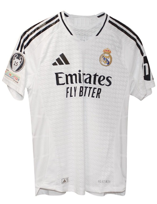derudover spiller Real Madrid også med et La Liga logo til højre ærme. Over liga badget sidder der et lille guld mærke der indikerer at Real Madrid er regerende mestre: Campeon La Liga 23/24.